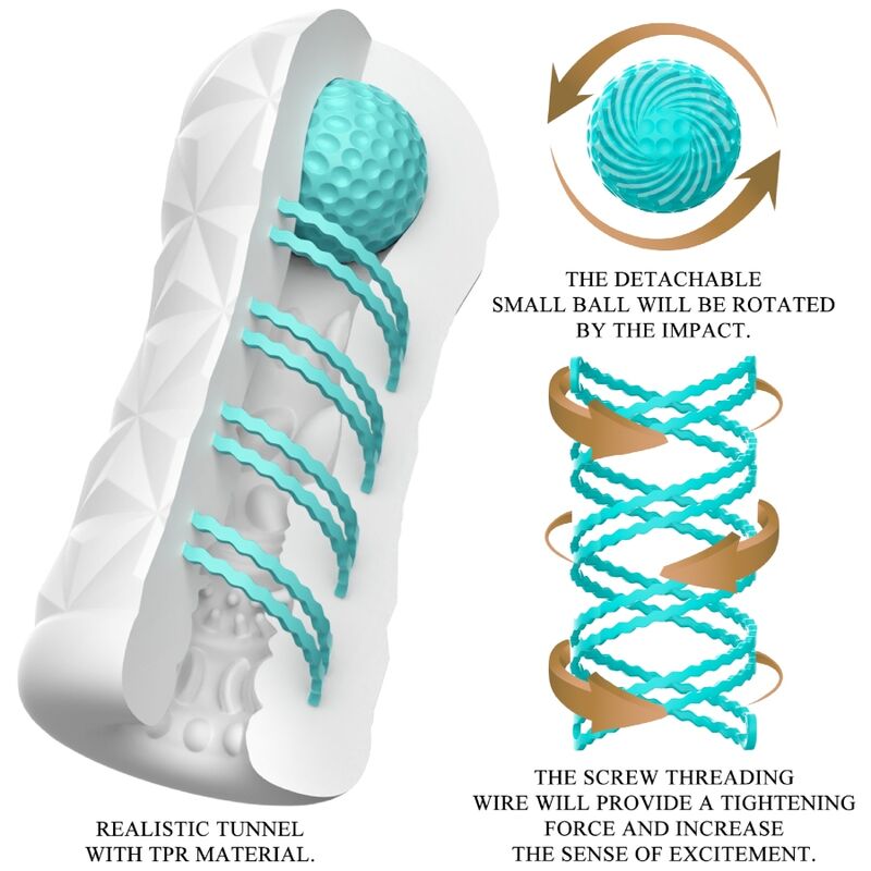 Lille værktøj til gigantisk onanisjov! Denne gennemsigtige og genanvendelige masturbator har en roterende spiral og en stimuleringskugle på siden, den roterende spiral får masturbatoren til at rotere under penetration, og kuglen på toppen kan stimulere det rigtige sted og give dig en ny fornemmelse. Skeden har en stimulerende og spændende tekstur indeni, der masserer penis intenst og dynamisk under manuelt arbejde. Du kan bruge denne stilfulde, hudvenlige masturbator igen og igen. Meget nem at bruge og ren fornøjelse!